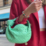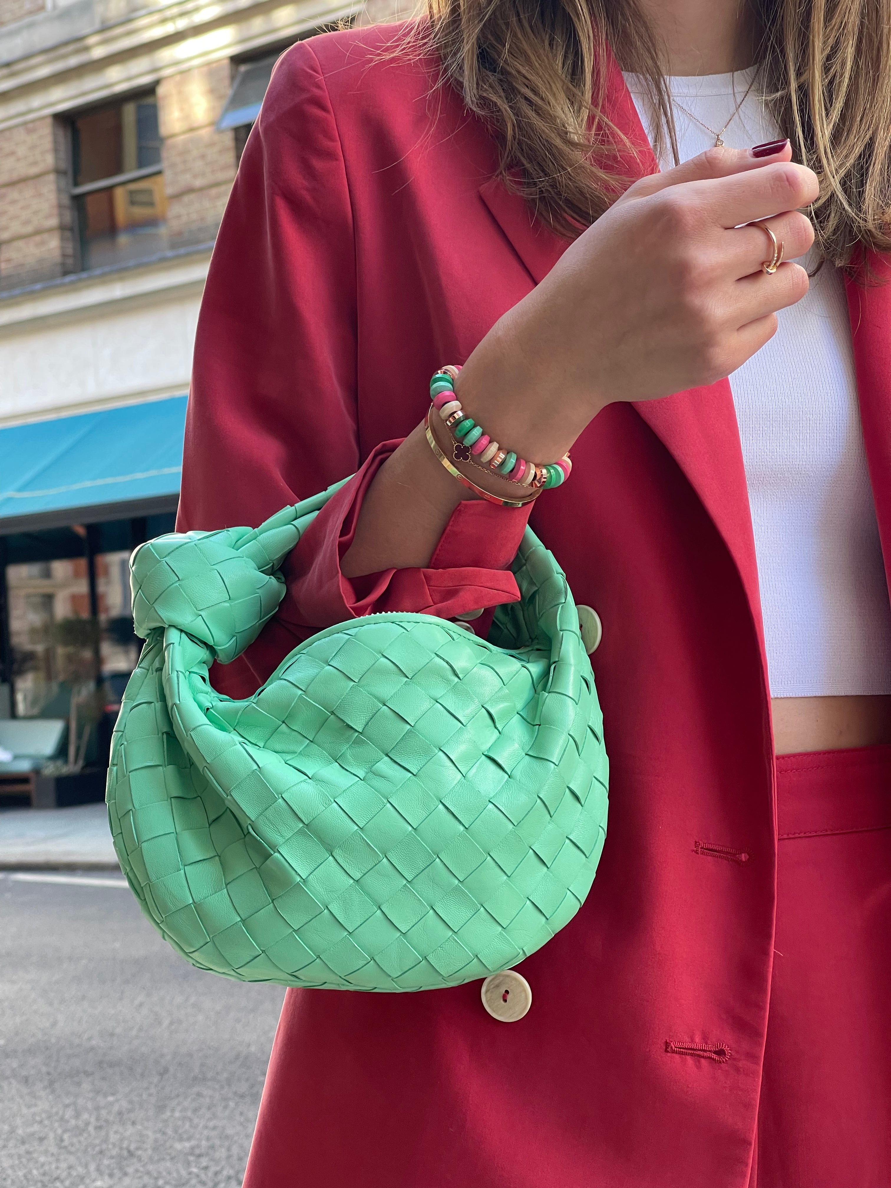 It's literal arm candy. The Macaron Bracelet is a nod to the iconic candy-bead bracelets of our childhood and features multicolored beads in blue, green, ivory, pink, and rose gold. It is coated in enamel and strung on an 18K rose-plated spring. Its weight feels substantial on your wrist and can be stacked or layered with our other bracelets. The perfect summer statement bracelet to compliment your look.